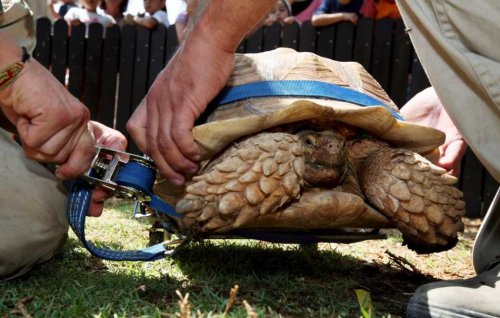 A 55 pound tortoise who lives in the zoo in Jerusalem, Israel, is paraplegic, that is her hind legs don’t move. But recently custom fit with a skateboard, Aravat isn’t staying home anymore. Now she ventures out all the time and has attracted a mate. There is a male tortoise that follows her around constantly and won’t let her alone… She is just too hot… too hip… with her shiny new skateboard! The guy tortoise is crazy about her.