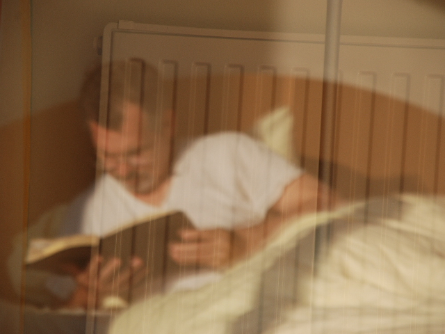 I sat on the sofa and Wayne lied in bed and read the Bible to me this morning before breakfast. I snapped this photo of his reflection in the veranda glass door. It reminded me of how we live our lives as believers–through a glass darkly–our vision is perfect especially as God’s Word lights our paths, but the way is not clear, often fuzzy as we search for the city, whose builder and maker is God!