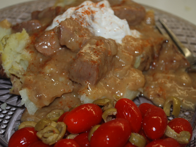 Beef and onion stew with tomato and olive salad on the side.