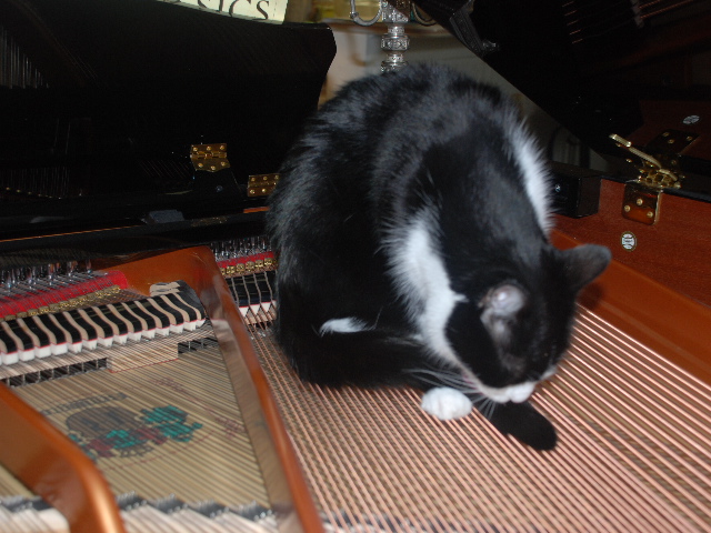 Today I looked up from my morning reading to discover that Oreo had jumped inside our grand piano. I rarely keep the lid open to the strings, but we had a concert and I opened it up and forgot it. So my curious Oreo jumped inside on the strings. His face looks like they are hurting his paws.