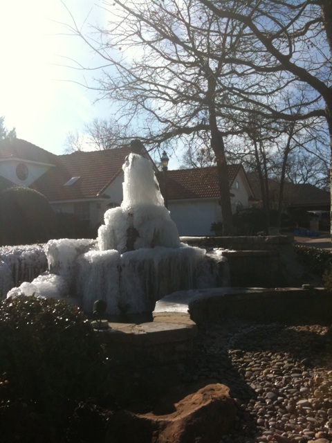 Much of the known world in the USA is in a deep freeze. My southern home in the states, Texas, is buried under the winter spell of ice. This is the fountain in our community. A friend posted this on FaceBook.