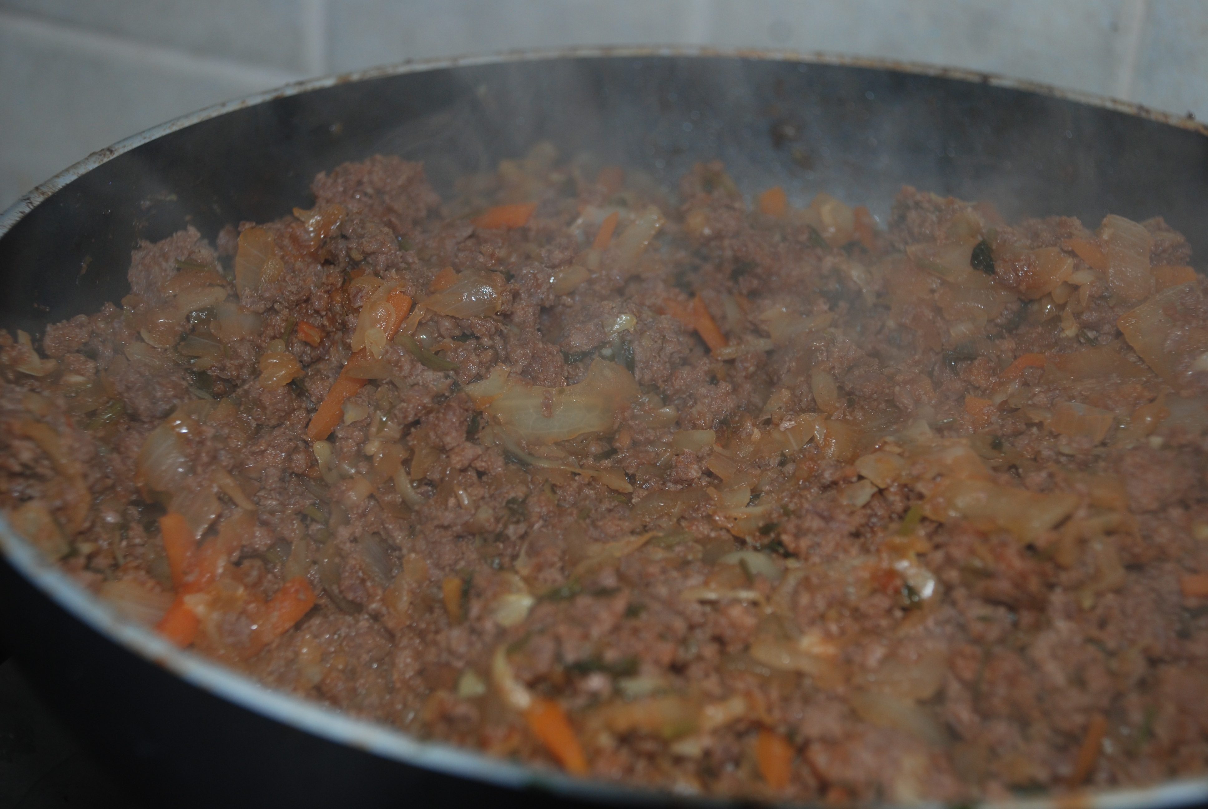 Brown meat and add the sautéed vegetables and all ingredients plus ½ cup water and cook until the liquid is gone.