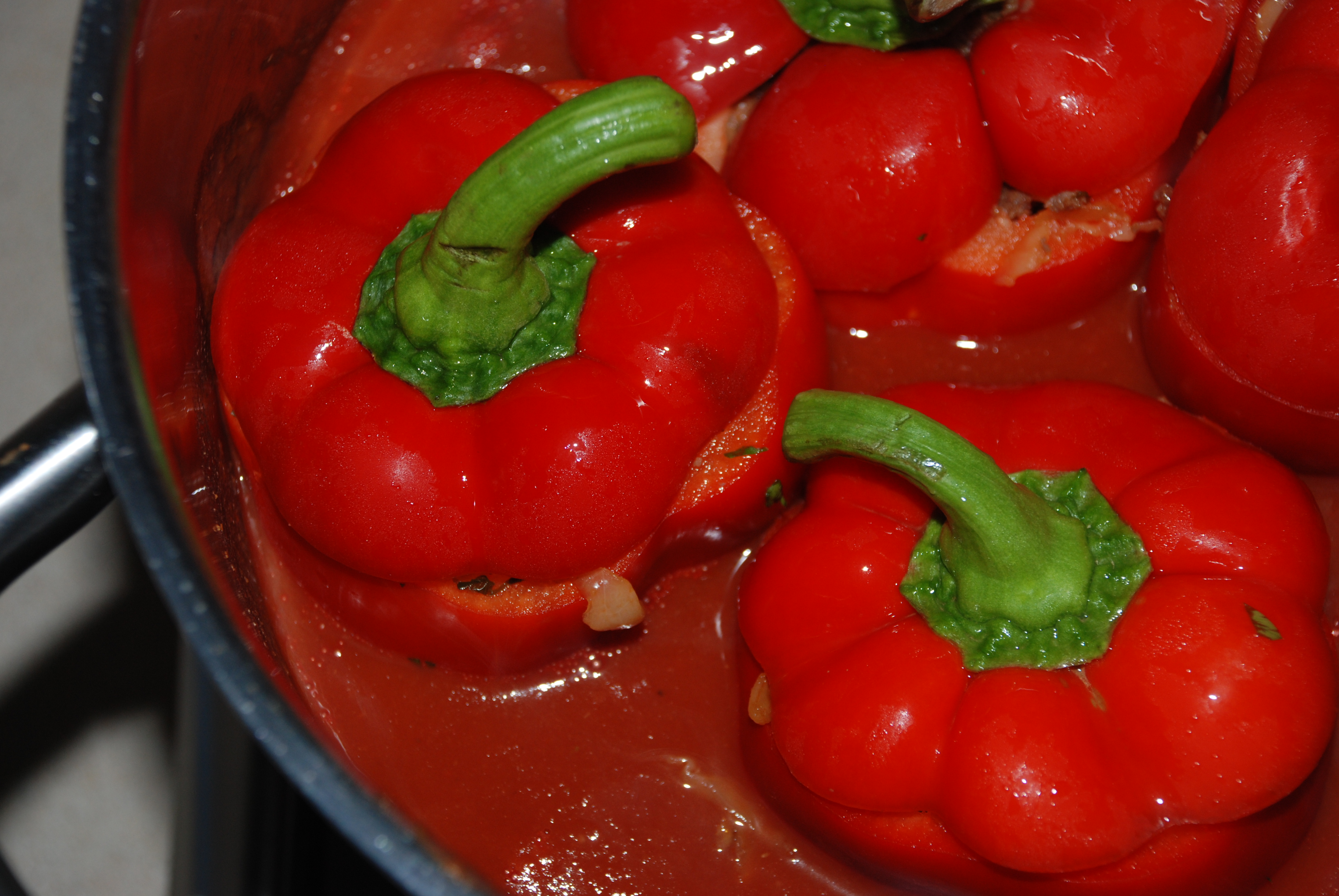 Generously pack each bell with hamburger mixture and place in a medium-size soup pot. Fill pot surrounding the bells with the can of crushed tomatoes, add a pinch of sugar and salt to tomatoes.