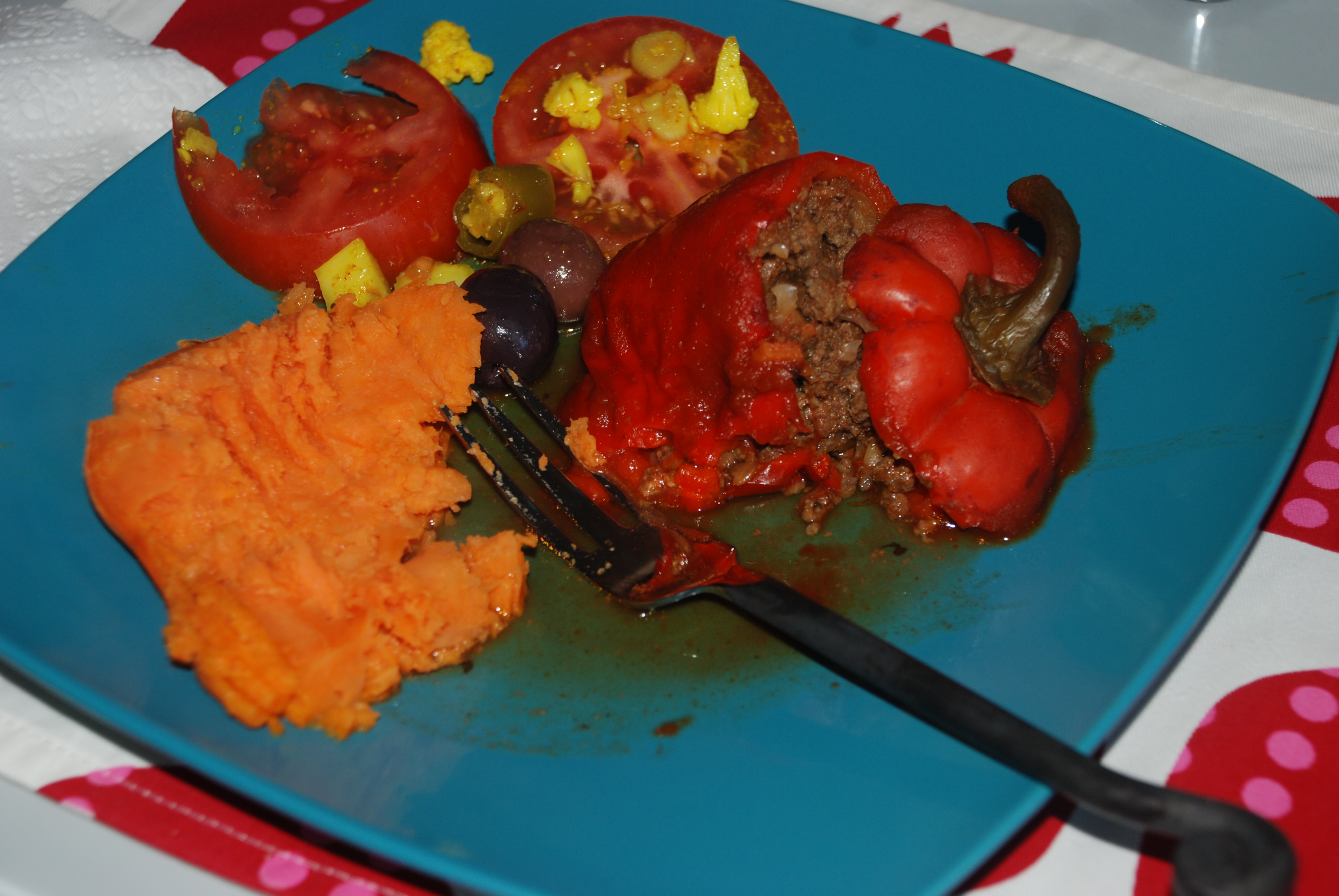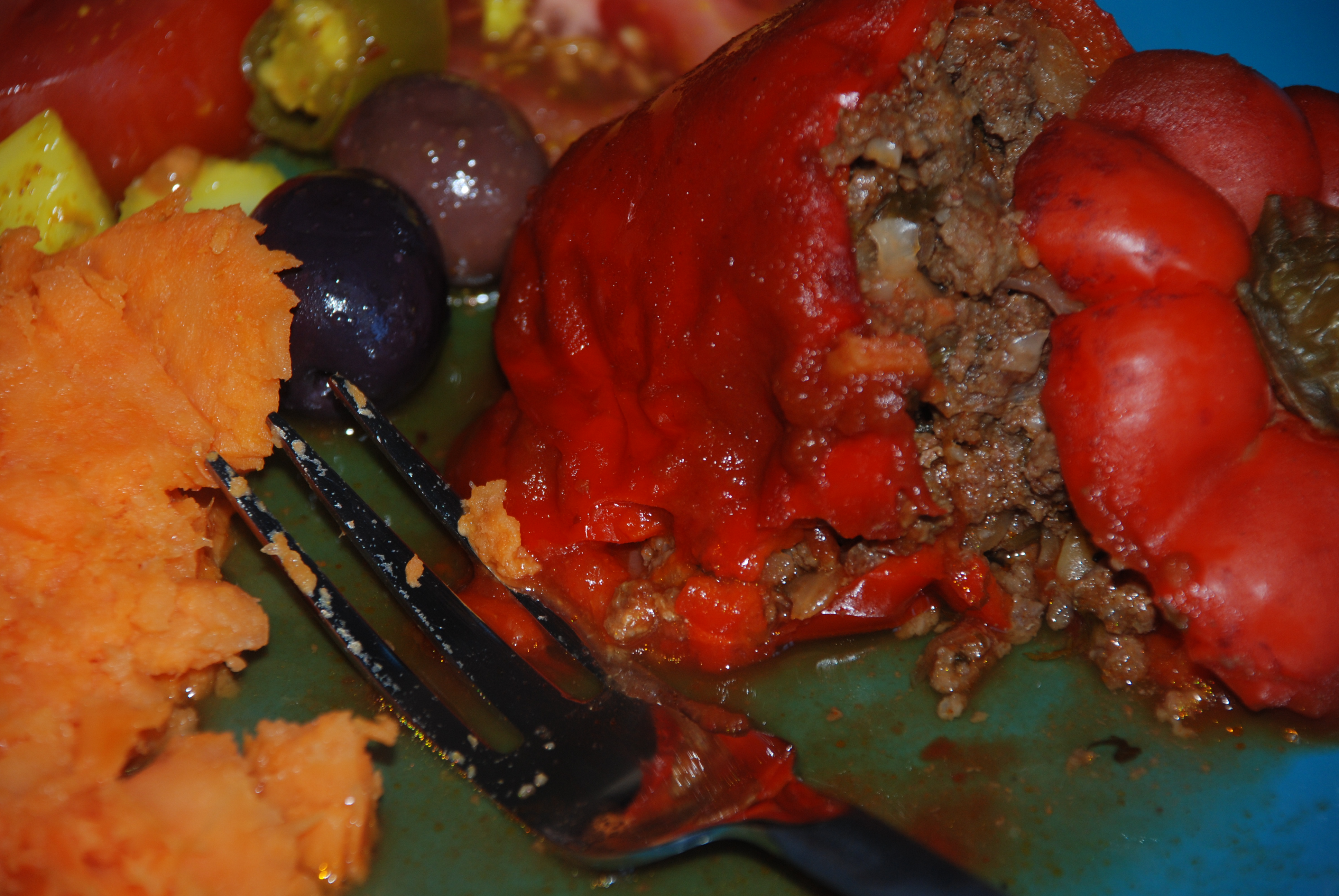 My husband loves this meal. This is sheer comfort food and great with mashed potatoes or rice. Today I served it with baked sweet potatoes, which I have never done, and they were a great complement to the sweetness of the tomato sauce that the peppers are slow-cooked in. Here’s the recipe.