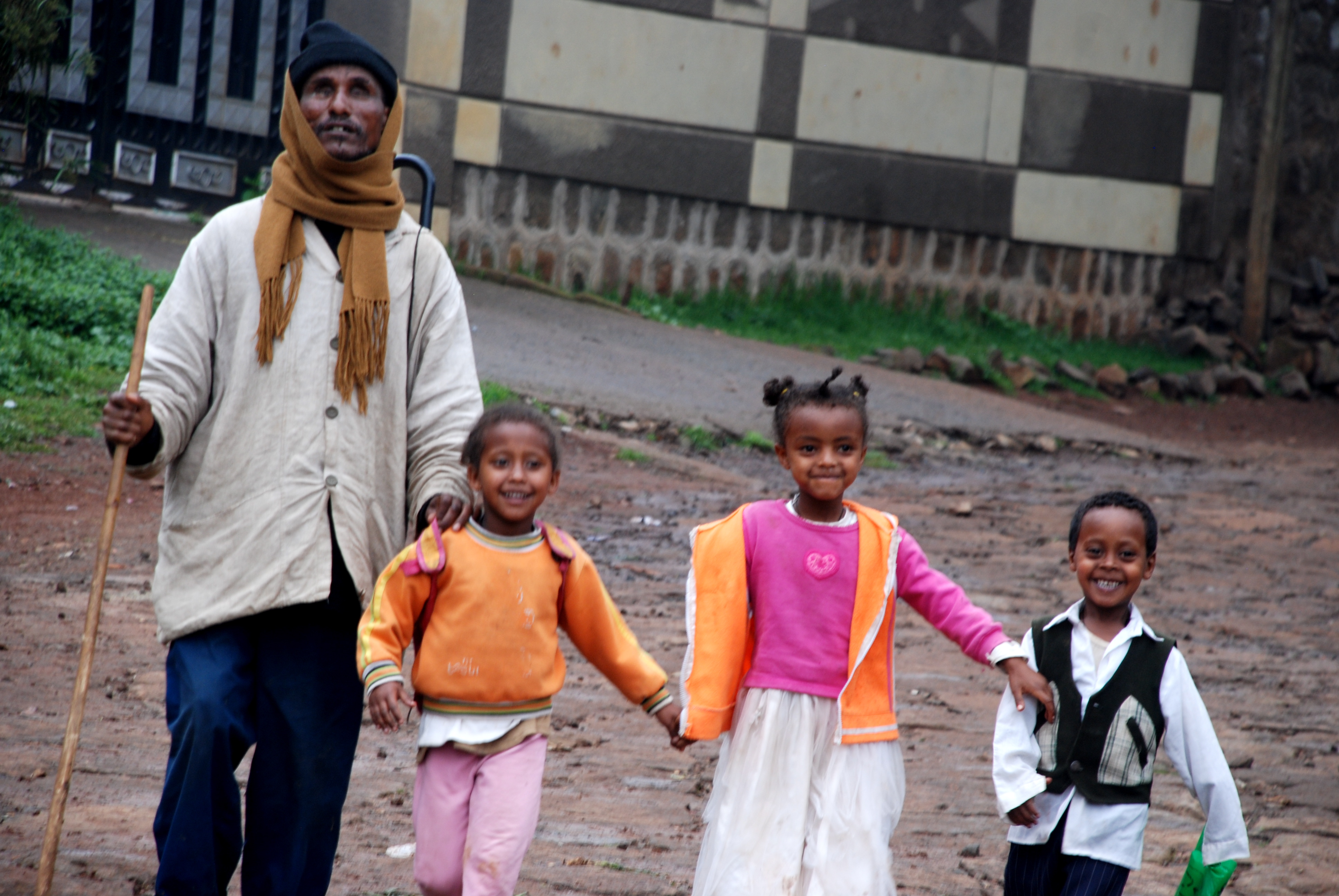 Children leading a blind man on the streets of Addis Ababa, Ethiopia.