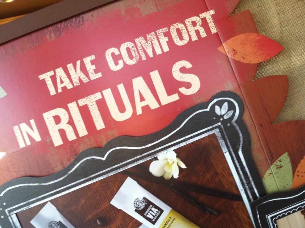 I love Starbuck’s new fall advertising slogan, “Take comfort in rituals.” With the cooler weather and holidays coming on, it sounds appealing, homespun, and almost magnetic. The mega coffee shop is hoping to sell more comfort in a cup this autumn by drawing you into the sweetness of including them as part of your daily routine.