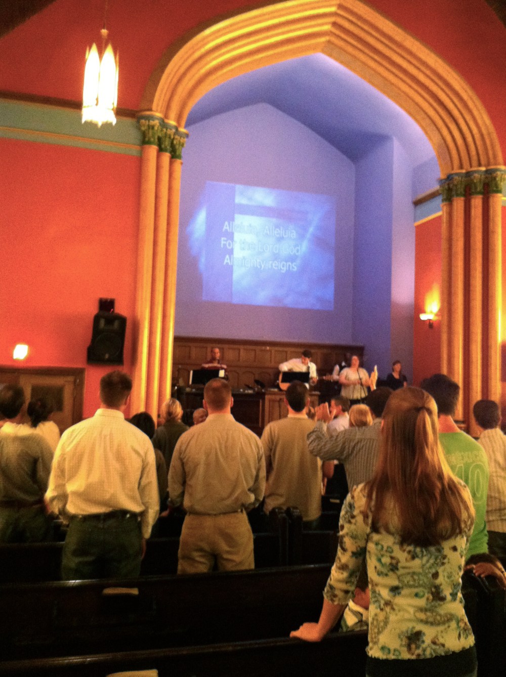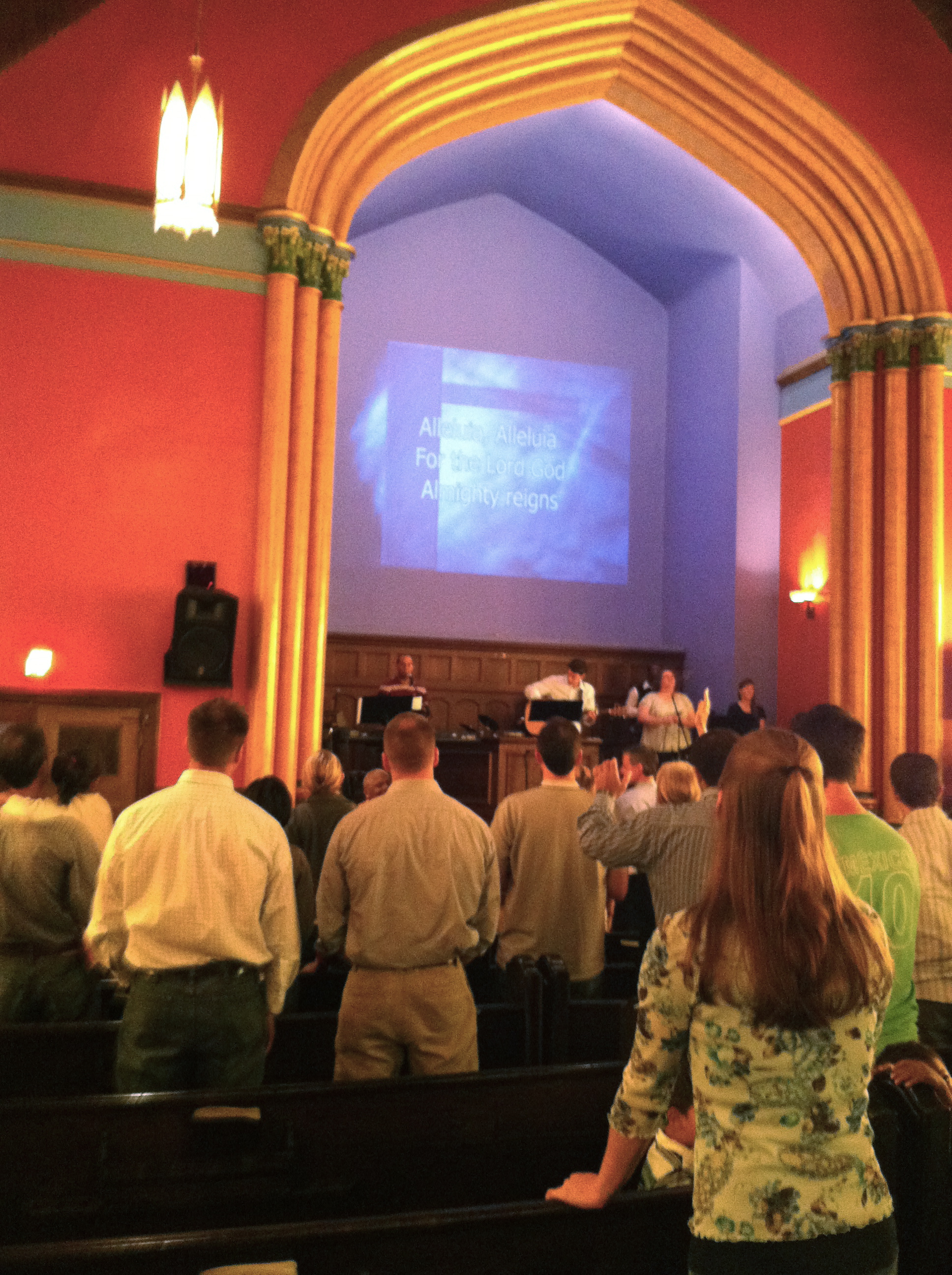 Yesterday we attended a service in an old city church in downtown Dallas. It was a sweet group of believers that are meeting there weekly and have been for several years. The old building is restored and full of its original beauty. I loved the stained glasses and wooden pews. I love the paint and the arches. I wasn’t captivated by the space alone, but I felt God in every ounce of the material assets before me when the congregation lifted the words in music, “Oh the blood of Jesus shed on Calvary… flows to the lowest valley and rises to the highest mountain… ” The beauty of the whole place came alive because of the truth of those words.