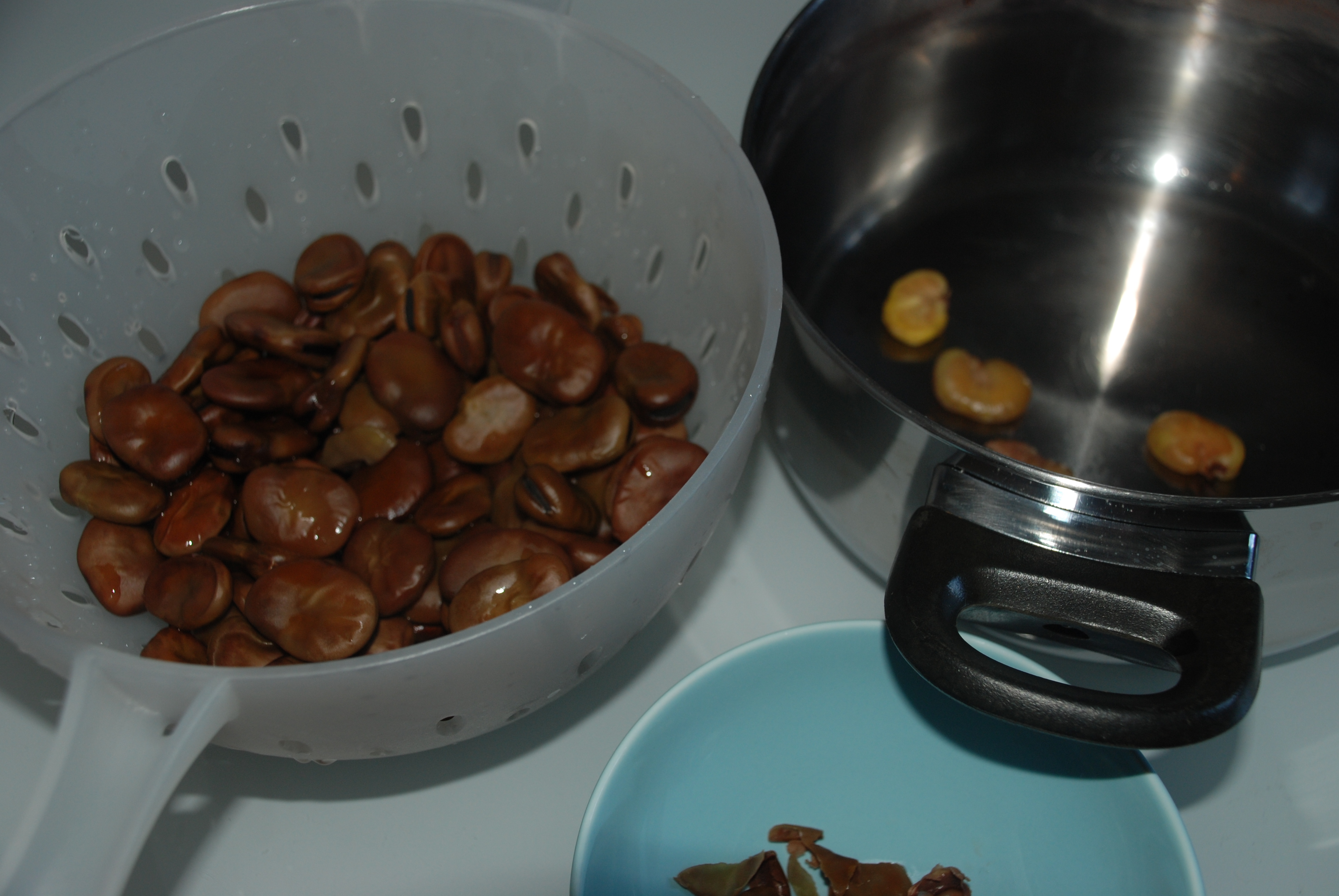 We are in Jerusalem now, and I found a package of dried beans in the kitchen cupboard. Today is as good as any day to use them. They are a bit labor intensive because they must be par-boiled and then shelled and boiled again. But I rather enjoyed the process this morning, especially with not much else on hand at the moment.