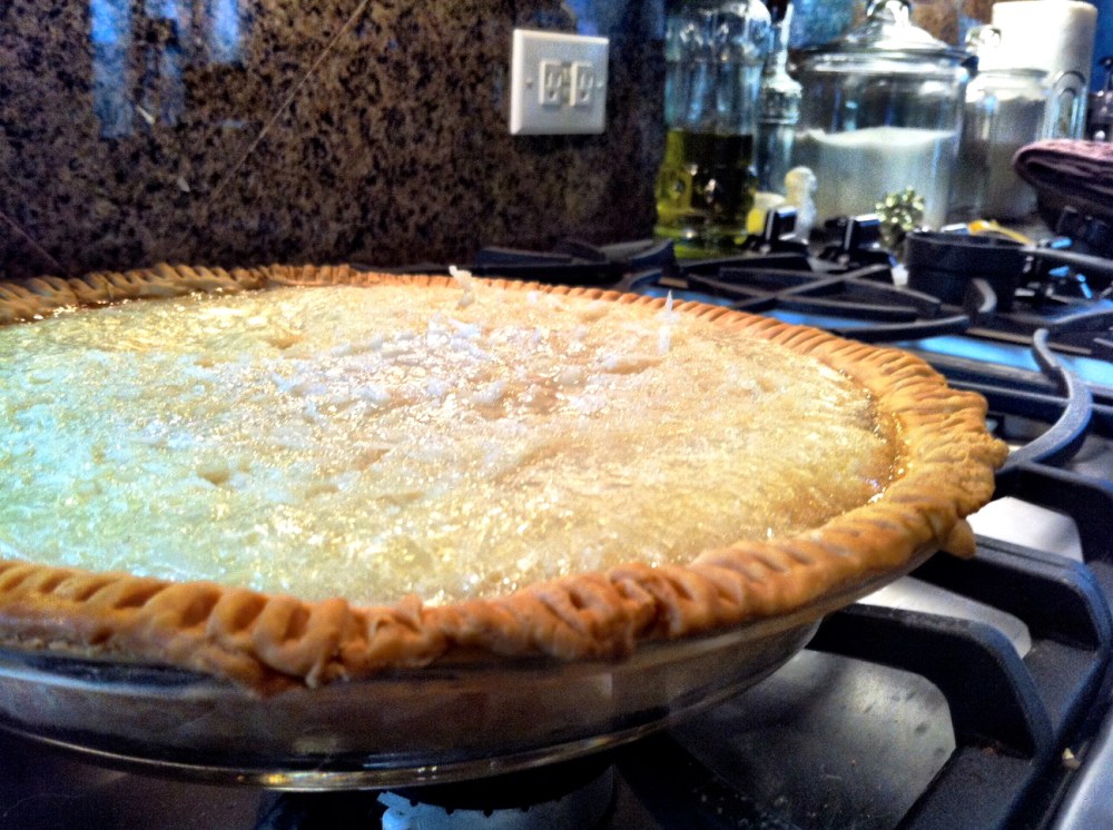 I didn’t want to take the time to do this, so I read a few recipes and took the basic idea from other custard-type pies baked in the oven like buttermilk, chess, or pumpkin pies and came up with this one for coconut-cream filling.
