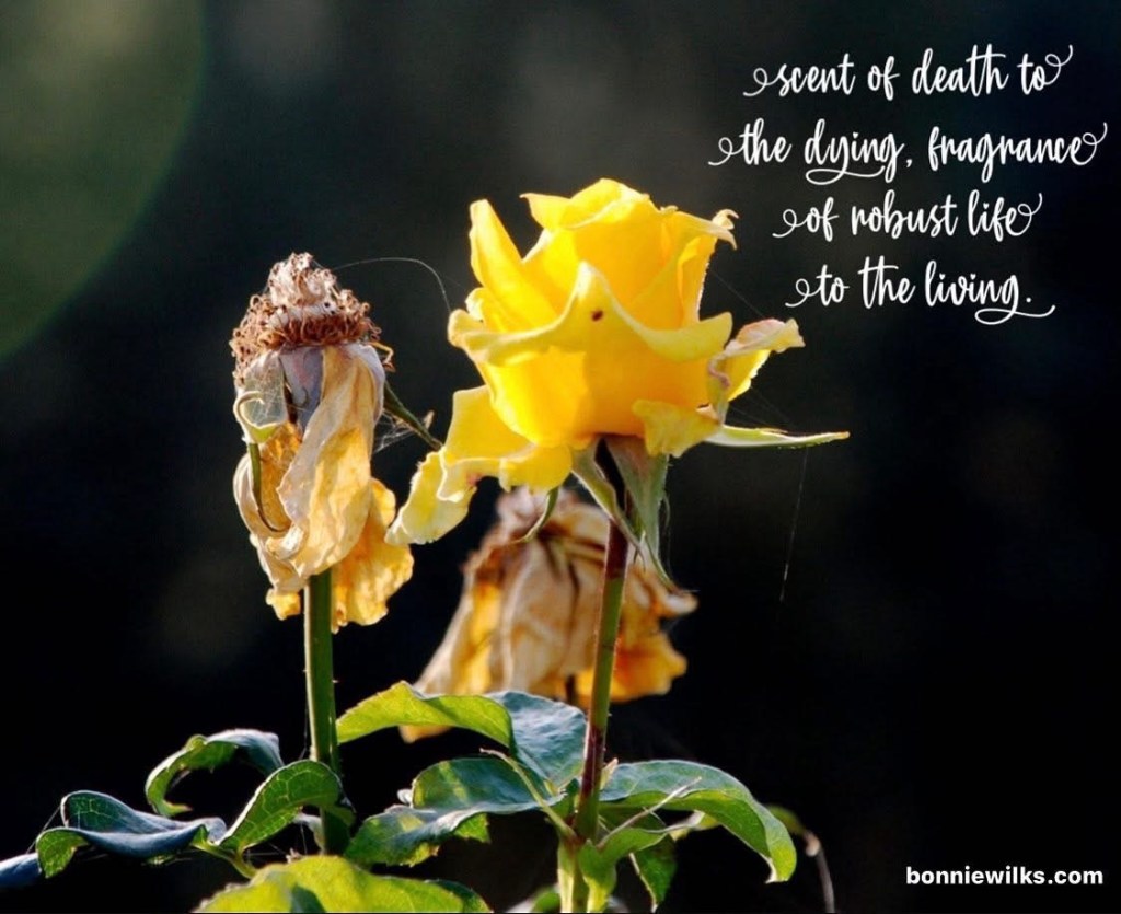“Our lives are a Christ-like fragrance rising up to God. But this fragrance is perceived differently by those who are being saved and by those who are perishing. But thank God! He has made us his captives and continues to lead us along in Christ’s triumphal procession. Now he uses us to spread the knowledge of Christ everywhere, like a sweet perfume. Our lives are a Christ-like fragrance rising up to God. But this fragrance is perceived differently by those who are being saved and by those who are perishing. To those who are perishing, we are a scent of death and doom. But to those who are being saved, we are a life-giving perfume. And who is adequate for such a task as this?” 2 Corinthians 2:14-16).